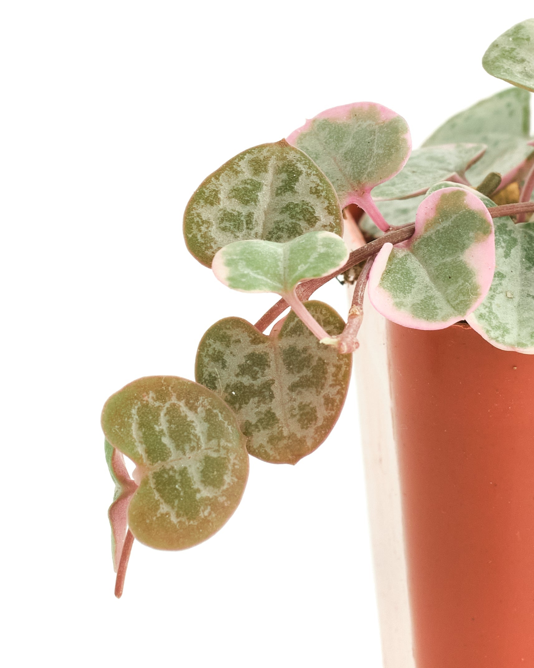 Pot: Variegated String of Hearts prefers to be slightly root-bound and doesn't require frequent repotting. When repotting, choose a pot that is only slightly larger than the current one.