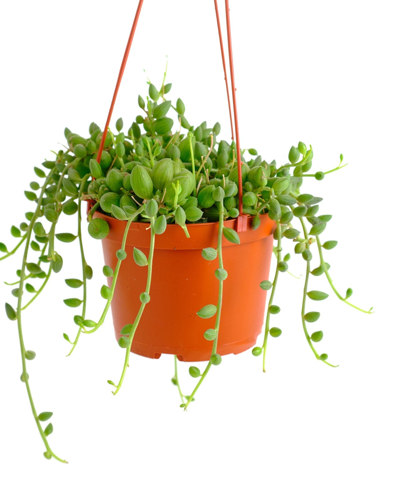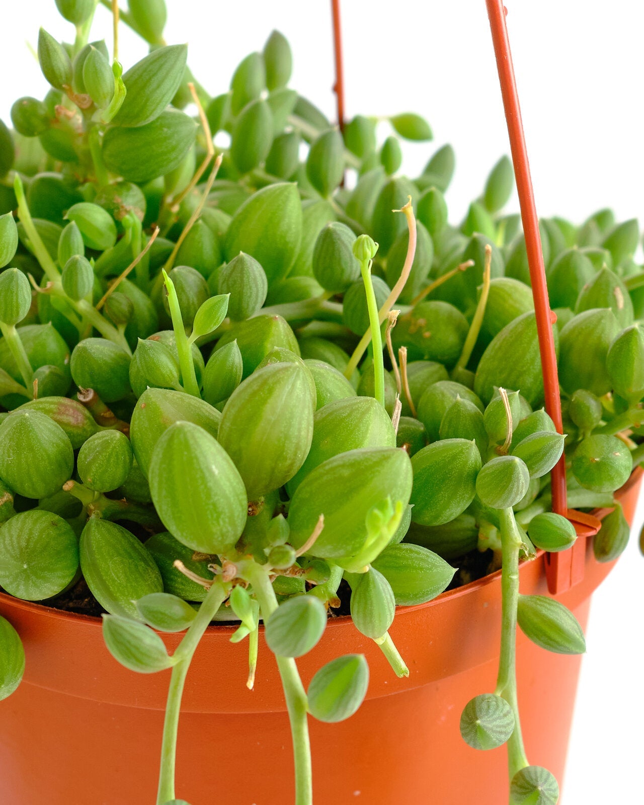 Curio herreanus 'String of Watermelons' is a sought-after succulent prized for its trailing growth and striking resemblance to miniature watermelons. Its dense clusters of bead-like leaves feature green stripes and translucent edges, making it a visually appealing addition to any space. Ideal for hanging containers or elevated positions with bright, indirect light, this plant thrives with moderate watering and well-draining soil. Perfect for succulent enthusiasts looking to add a unique and low-maintenance plant to their collection.