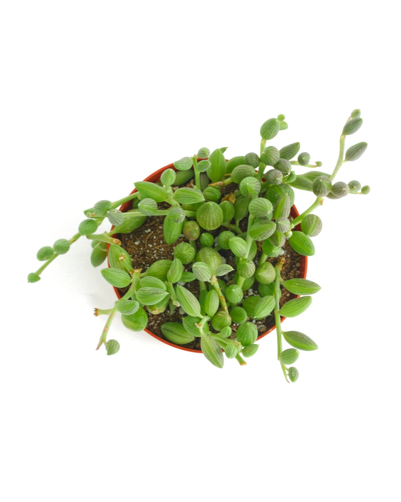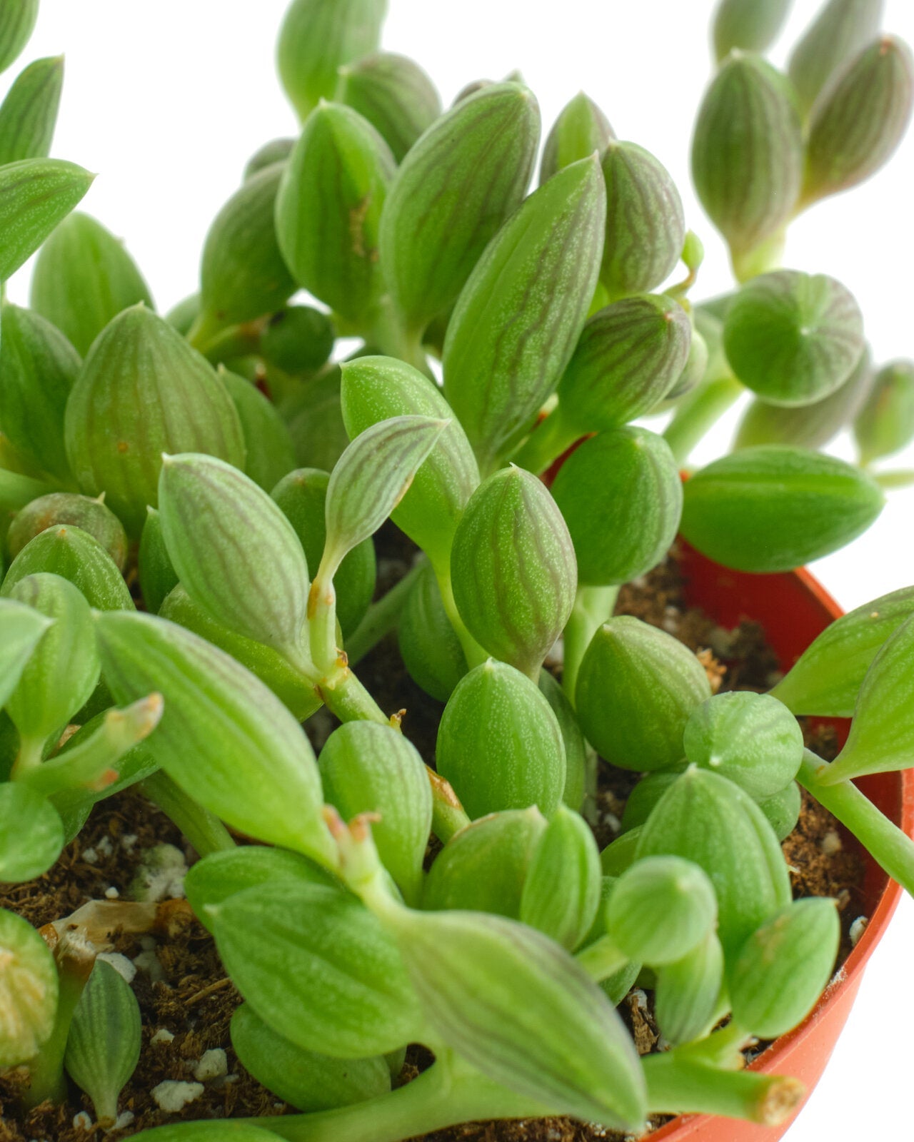 Curio herreanus 'String of Watermelons' is a sought-after succulent prized for its trailing growth and striking resemblance to miniature watermelons. Its dense clusters of bead-like leaves feature green stripes and translucent edges, making it a visually appealing addition to any space. Ideal for hanging containers or elevated positions with bright, indirect light, this plant thrives with moderate watering and well-draining soil. Perfect for succulent enthusiasts looking to add a unique and low-maintenance plant to their collection.