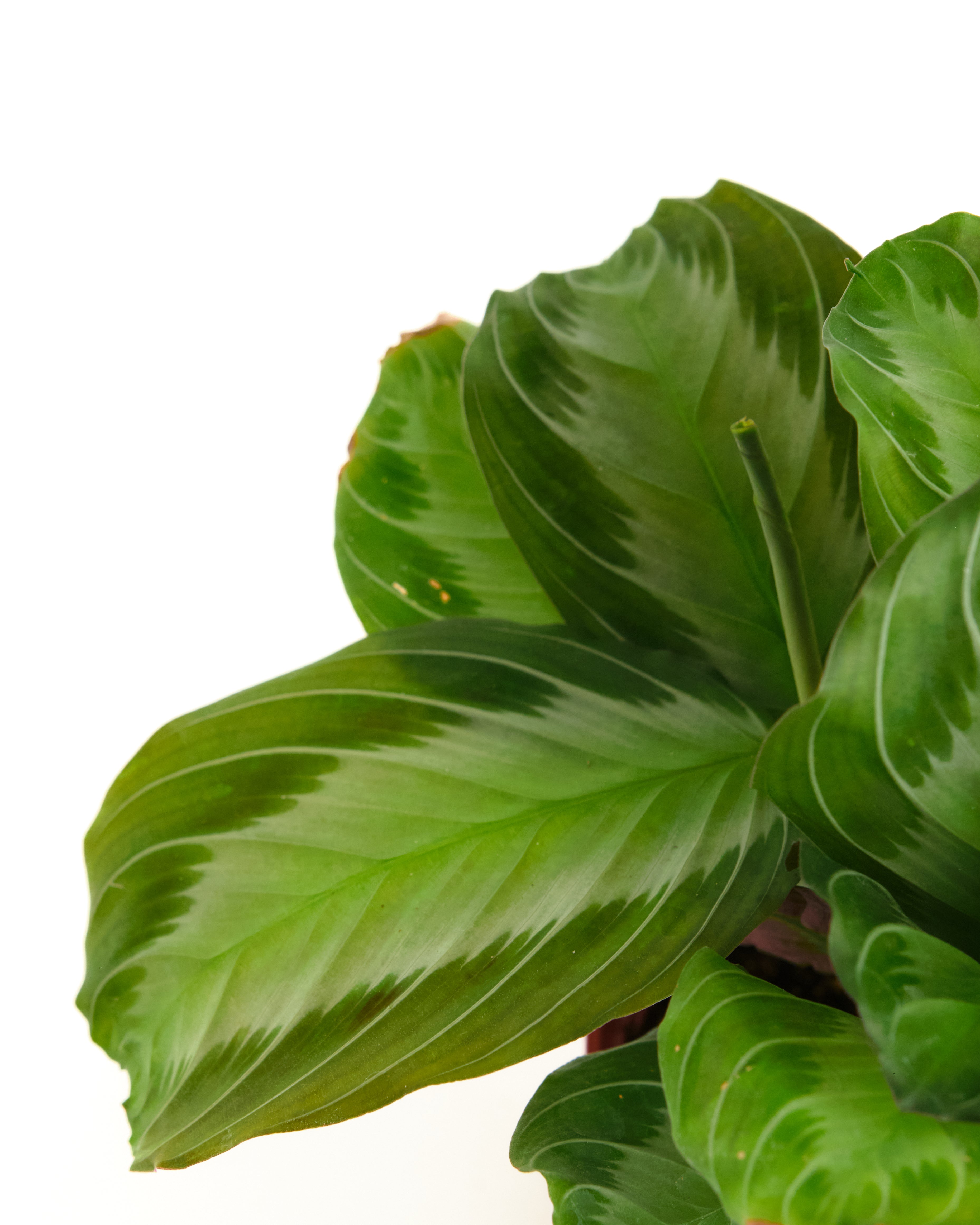 The Maranta Silver Band, commonly known as the Silver Band Prayer Plant, is a captivating indoor plant renowned for its distinctive and striking foliage. Its large, oval leaves feature a striking silver-gray band along the midrib, creating a beautiful contrast against the deep green background. This plant is celebrated for its unique, folding leaves that move in response to light, resembling hands in prayer, which adds an interactive element to your plant collection. Thriving in low to medium, indirect light, the Maranta Silver Band is perfect for enhancing any room with its lush, elegant appearance. Its easy-care nature and eye-catching leaves make it an excellent choice for both novice and experienced plant enthusiasts.